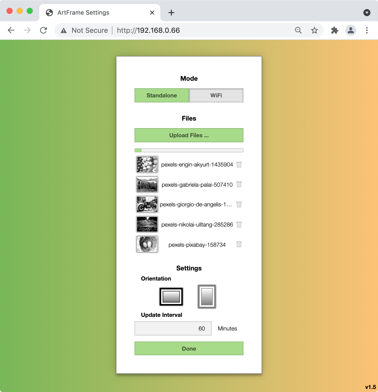 Short press just changes the picture, long press activates the configuration mode, where the device creates a local WiFi hotspot that allows uploading of images, specifying a web server to fetch images from and changing of configuration details like defining the time between automatic picture changes. Already uploaded images can now be identified by their thumbnails.